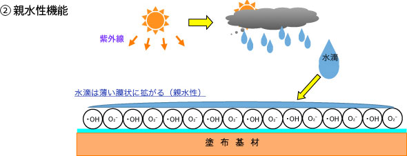 自動車のバックミラーや道路のミラー等を酸化チタンでコーティングしておけば、水がはねついても表面で水滴とはならず、そのまま流れ落ち、雨天時の視認性が大幅に向上します。
